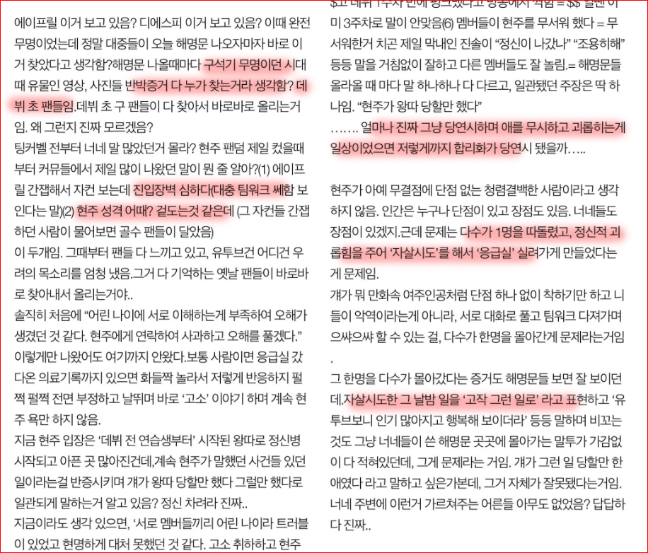 이현주 주장은 "데뷔전 연습생 시절부터 왕따를 당했다"인데요.